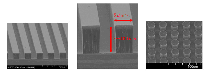 アスペクト比は5:1(膜厚50μm以上)可能で高さ2~100μ可能。